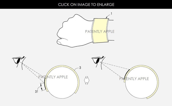 從專(zhuān)利圖中可以看出,這種智能手表的表盤(pán)外有一圈環(huán)形彎曲屏幕,可以顯示時(shí)間、天氣以及當(dāng)前播放的音樂(lè)等。據(jù)稱(chēng)環(huán)形彎曲屏幕將被未來(lái)的Gear智能手表采用。