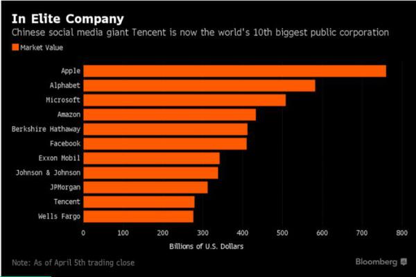 【環(huán)球科技報道】4月6日消息,在全球十大上市公司的隊伍中終于出現(xiàn)了中國企業(yè)的身影。據(jù)彭博社報道稱,中國科技企業(yè)騰訊在周三已經(jīng)超越美國富國銀行,成為全球第十大上市公司,市值已經(jīng)達(dá)到2790億美元。這也是唯一上榜全球前十的中國科技公司。