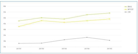 2017年前5個(gè)月,愛奇藝APP、騰訊視頻APP、優(yōu)酷APP月活數(shù)量趨勢圖