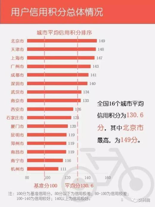 日前,摩拜單車聯(lián)合交通運輸部科學研究院發(fā)布《2017年中國城市共享單車信用體系評價報告(上半年)》(以下簡稱“報告”),北京、天津、上海三個城市共享單車用戶信用排名前三位。
