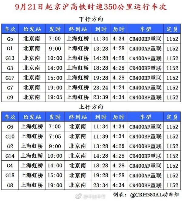 現(xiàn)在,中國(guó)鐵路再次發(fā)出公告稱,從9月21日起,他們將安排7對(duì)“復(fù)興號(hào)”動(dòng)車組在京滬高鐵按時(shí)速350公里運(yùn)行,與此同時(shí)還送出了這些列車的詳細(xì)車次、列車時(shí)刻表。