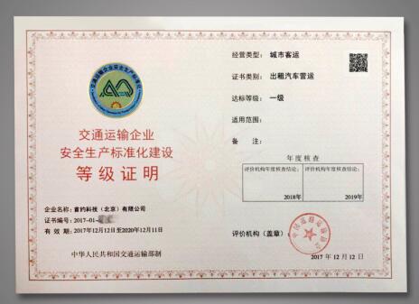 2017年12月12日,中國(guó)道路運(yùn)輸協(xié)會(huì)城市客運(yùn)分會(huì)受交通運(yùn)輸部委托,根據(jù)《交通運(yùn)輸企業(yè)安全生產(chǎn)標(biāo)準(zhǔn)化建設(shè)評(píng)價(jià)管理辦法》及相關(guān)標(biāo)準(zhǔn)規(guī)范的要求,將我國(guó)的第一張“交通運(yùn)輸企業(yè)安全生產(chǎn)標(biāo)準(zhǔn)化建設(shè)等級(jí)證明”頒發(fā)給首汽約車,達(dá)標(biāo)等級(jí)為“一級(jí)”。首汽約車是我國(guó)首個(gè)獲得該證書的網(wǎng)約車企業(yè),同時(shí)也是截至目前唯一一個(gè)獲得該證書的交通運(yùn)輸企業(yè)。