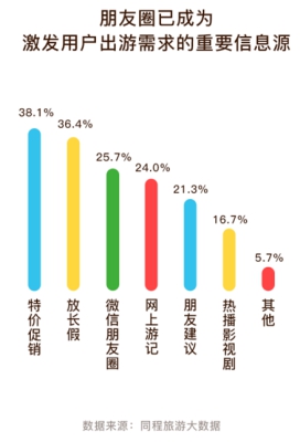 事實(shí)上,微信平臺(tái)不僅在用戶出游前的資訊獲取和出游過程的動(dòng)態(tài)分享中扮演重要角色,而且對(duì)用戶的旅游購買決策也擁有較大的影響力!秷(bào)告》中來自同程旅游大數(shù)據(jù)的研究顯示,“特價(jià)促銷”、“放長(zhǎng)假”和好友的朋友圈分享是影響人們旅游購買決策的三大因素。有相當(dāng)一部分微信用戶在看到好友朋友圈分享的出游動(dòng)態(tài)后萌生出游的想法,或者通過好友群等渠道獲取出游建議等信息。