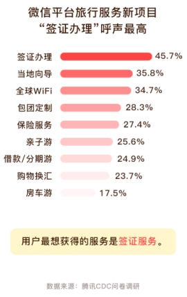 《報(bào)告》數(shù)據(jù)顯示,除了標(biāo)準(zhǔn)化程度較高的交通票務(wù)、住宿等旅行產(chǎn)品外,用戶還希望微信平臺(tái)(錢包)能夠新增簽證辦理、當(dāng)?shù)叵驅(qū)、全球WiFi、包團(tuán)定制、保險(xiǎn)、親子游、分期游、購物換匯、房車游等旅行服務(wù)(產(chǎn)品)。這表明,微信用戶希望在微信平臺(tái)上獲得更加豐富的旅行服務(wù)(產(chǎn)品)。