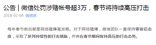 日前,微信派公布了春節(jié)期間對于涉嫌網(wǎng)絡賭博的處罰公告——《公告 | 微信處罰涉賭帳號超3萬,春節(jié)將持續(xù)高壓打擊》。