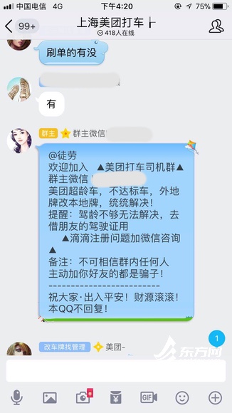 “外地牌照做網(wǎng)約車的不少,而且現(xiàn)在美團正在大量招募司機,不會查得很嚴!边@位從事網(wǎng)約車已近4年的司機還向記者道出了內(nèi)行所知的“門道”:“一般外地車輛改一個滬牌需要400到600元,我已經(jīng)推薦幾個朋友試過了,沒什么問題。”他還向記者展示了“美團打車”的一個上海司機QQ群,群內(nèi)寫明:“美團超齡車,不達標車,外地牌改本地牌,統(tǒng)統(tǒng)解決。駕齡不夠三年的,統(tǒng)統(tǒng)搞定!