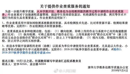 隨著各大高校紛紛迎來開學季,一些高校的教務系統(tǒng)也填了新“設(shè)備”。近日,記者從清華大學官網(wǎng)了解到,從今年秋季學期開始,清華大學將為全校教師提供教學過程中課程作業(yè)的查重服務,系全國首個對學生課程作業(yè)查重的高校。