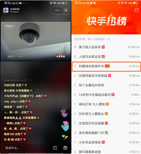 從開播到收官,《國(guó)家監(jiān)察》的直播間觀看總?cè)舜纬掷m(xù)增長(zhǎng),相關(guān)話題多次登上快手站內(nèi)熱榜。1月12日,首播第一集《擘畫藍(lán)圖》便登上站內(nèi)熱榜第四位,直播間觀看總?cè)舜纬?60萬(wàn),到14日,第四集《護(hù)航民生》的直播間觀看總?cè)舜我堰_(dá)480萬(wàn),播放到第五集時(shí),圍觀用戶已經(jīng)超過(guò)了500萬(wàn)人次。