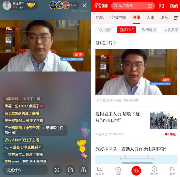 2月6日,“學(xué)習(xí)強國”學(xué)習(xí)平臺與快手?jǐn)y手,邀請相關(guān)領(lǐng)域?qū)<、名醫(yī),為全國用戶就疫情防護(hù)進(jìn)行不同主題的科普和答疑。首場直播由上海市肺科醫(yī)院副主任醫(yī)師胡洋主講,系統(tǒng)地介紹了疫情防護(hù)知識并為老鐵們辟謠?焓钟脩魹楹t(yī)生送出181.35萬個贊。