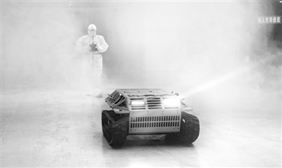 日前,在武昌方艙醫(yī)院,醫(yī)護(hù)人員操作防疫消殺機(jī)器人對方艙醫(yī)院內(nèi)部消毒。新華社記者 熊琦攝