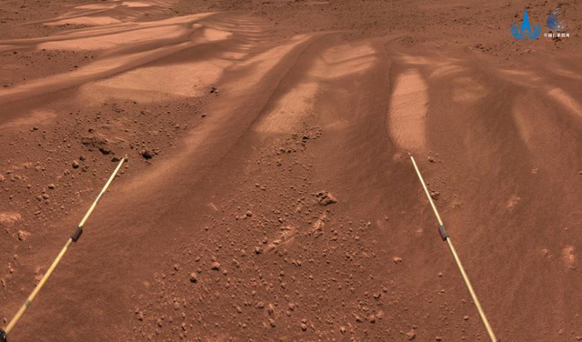 2021年5月22日10時(shí)40分,“祝融號(hào)”火星車駛達(dá)火星表面,開始在軌測試和巡視探測,先后傳回“著陸點(diǎn)全景”、“地形地貌”、“中國印跡”和“著巡合影”等影像圖。