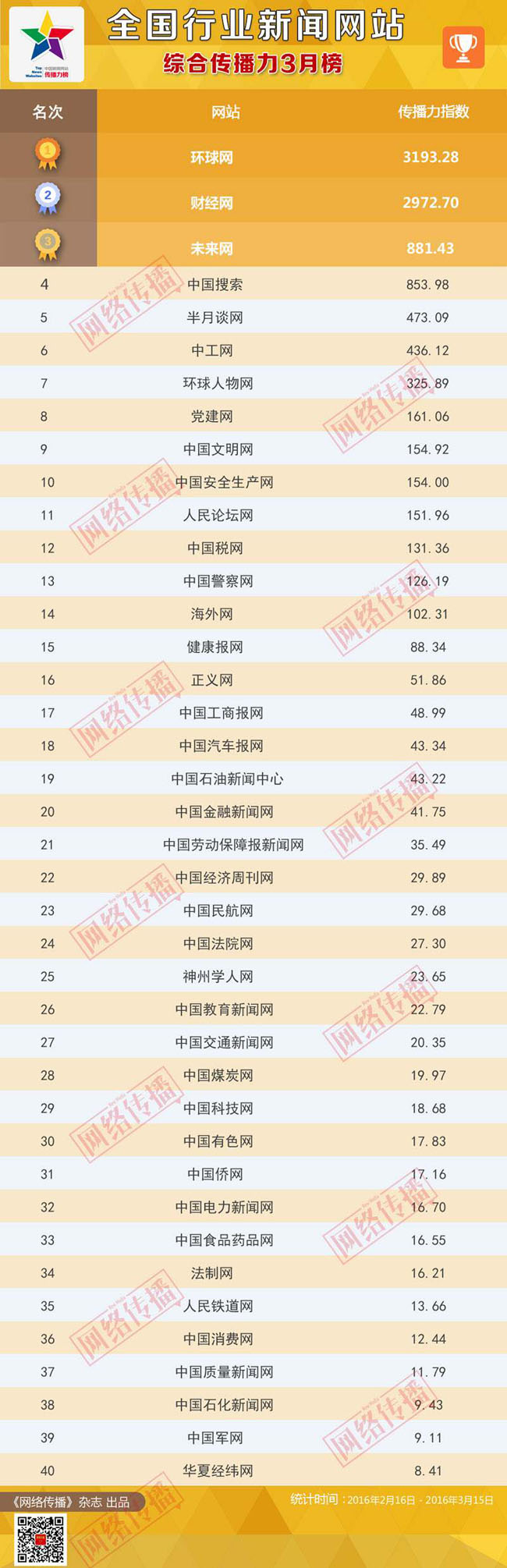 中央網(wǎng)信辦《網(wǎng)絡(luò)傳播》雜志傾力打造的“全國行業(yè)新聞網(wǎng)站傳播力2016年3月榜”今日正式發(fā)布。