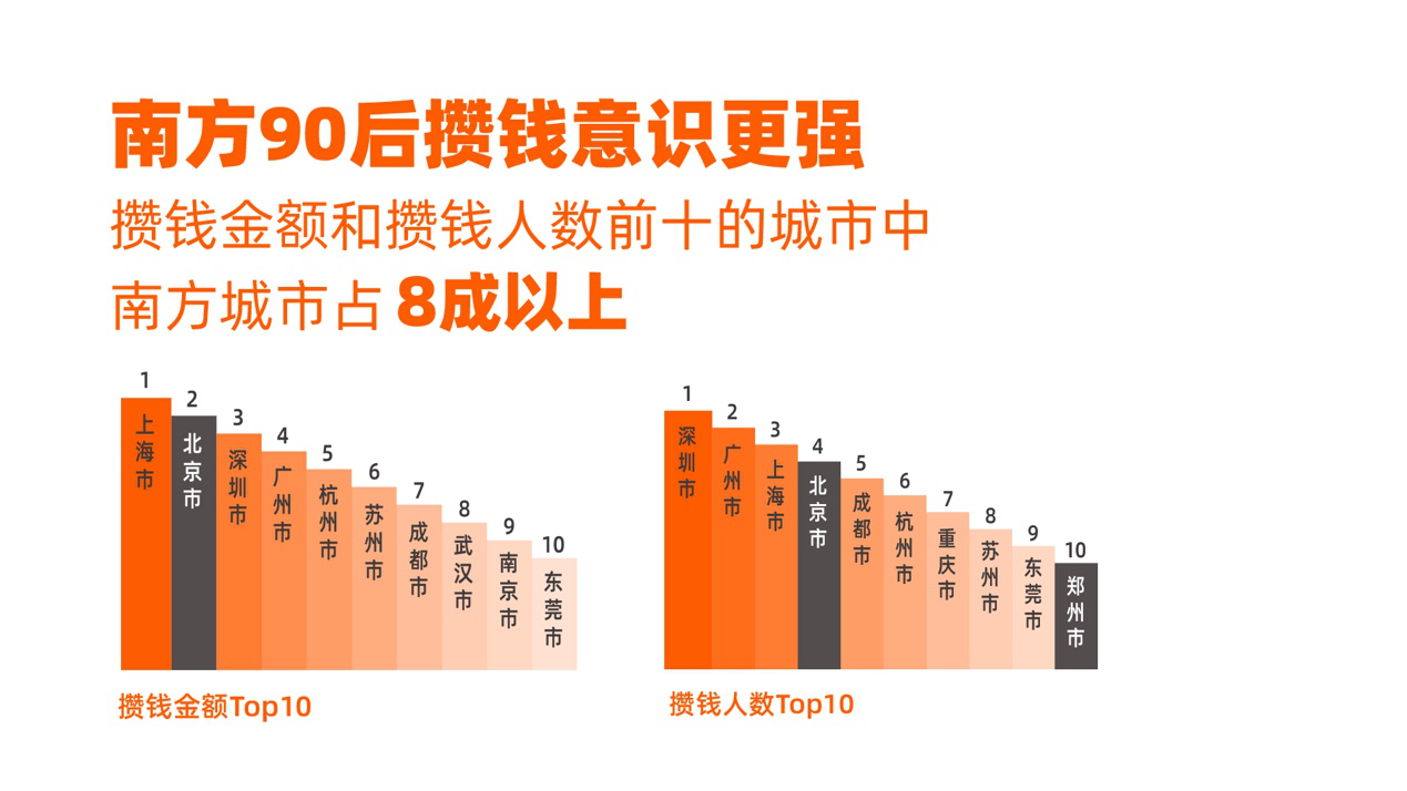 南方人精打細(xì)算的品質(zhì)也反映到了攢錢上。報告顯示,90后攢錢金額和攢錢人數(shù)前十的城市中,南方城市占8成以上,南方90后攢錢意識更強(qiáng)。