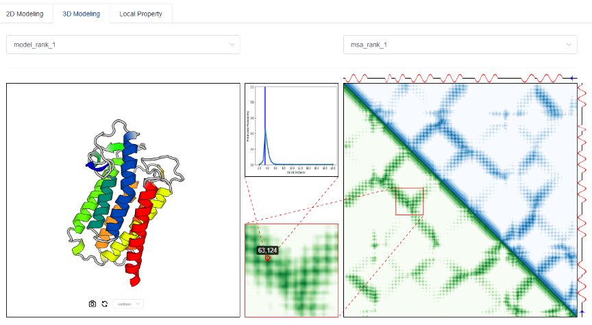 tFold server的3D Modeling輸出頁面。左邊部分為從頭折疊得到的3D蛋白模型;右邊部分是該3D模型在給定的預測殘基對距離矩陣下的偏差。