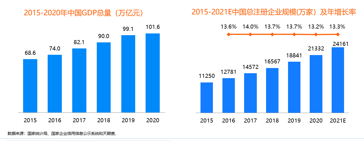 中國GDP破百萬億且逐年增長,近5年中國累計注冊企業(yè)增加了1億,這些為中國商旅管理市場提供了良好外圍環(huán)境驅(qū)動。