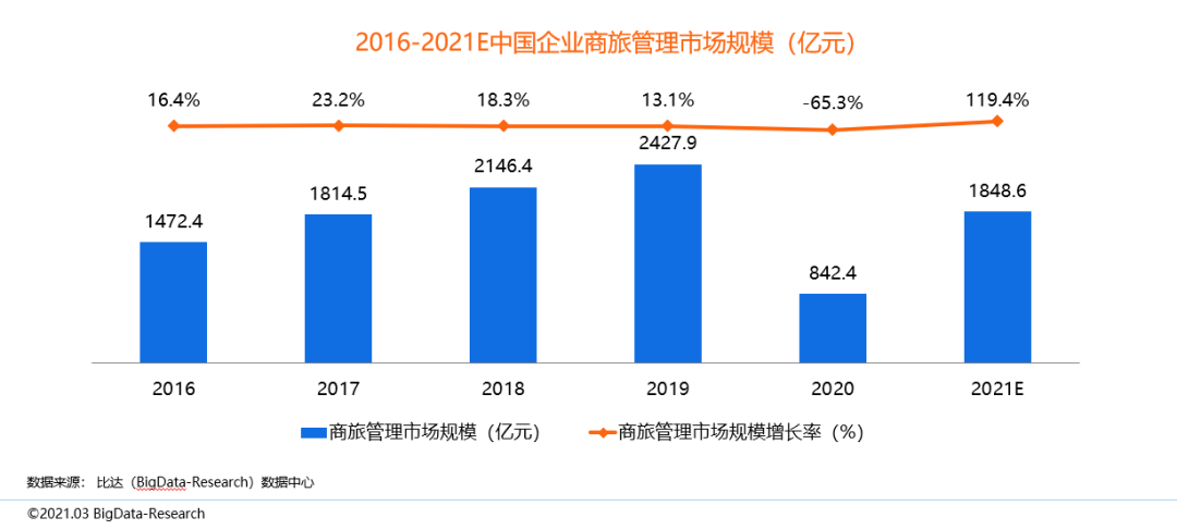 疫情對中國商旅管理市場影響明顯,特別是2020年,中國企業(yè)商旅管理市場規(guī)模下滑超65%。隨著國內(nèi)疫情基本得到有效控制,預(yù)計2021年商旅管理市場將大幅回暖,市場規(guī)模預(yù)計達(dá)1848.6億元。