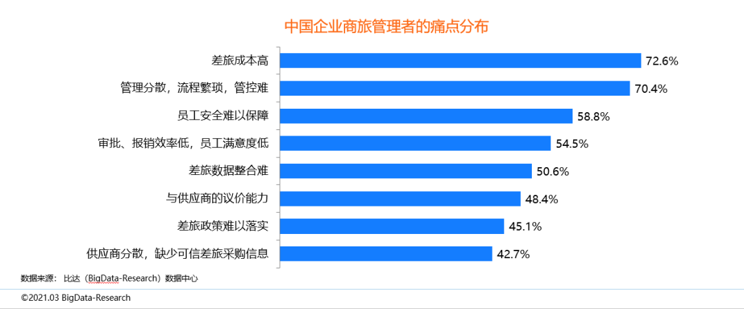 通常,人力成本和差旅成本是企業(yè)支出的兩大成本,差旅成本占企業(yè)支出的10-20%。在企業(yè)差旅方面,調(diào)查結(jié)果顯示,對于管理者來說,“差旅成本高”是最大的痛點,而“管理分散,流程繁瑣,管控難”也是企業(yè)管理者面臨的主要問題。