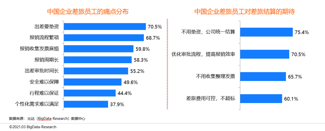 調(diào)查數(shù)據(jù)顯示,“出差要墊資”(70.5%)和“報銷流程繁瑣”(68.7%)是中國企業(yè)商旅員工的最主要的痛點,多數(shù)差旅員工還認(rèn)為報銷收集發(fā)票麻煩、報銷周期長、出差審批時間長。而對差旅結(jié)算的期待方面,七成以上的差旅員工期待“不用墊資,公司統(tǒng)一結(jié)算”、“優(yōu)化審批流程,提高報銷效率”。