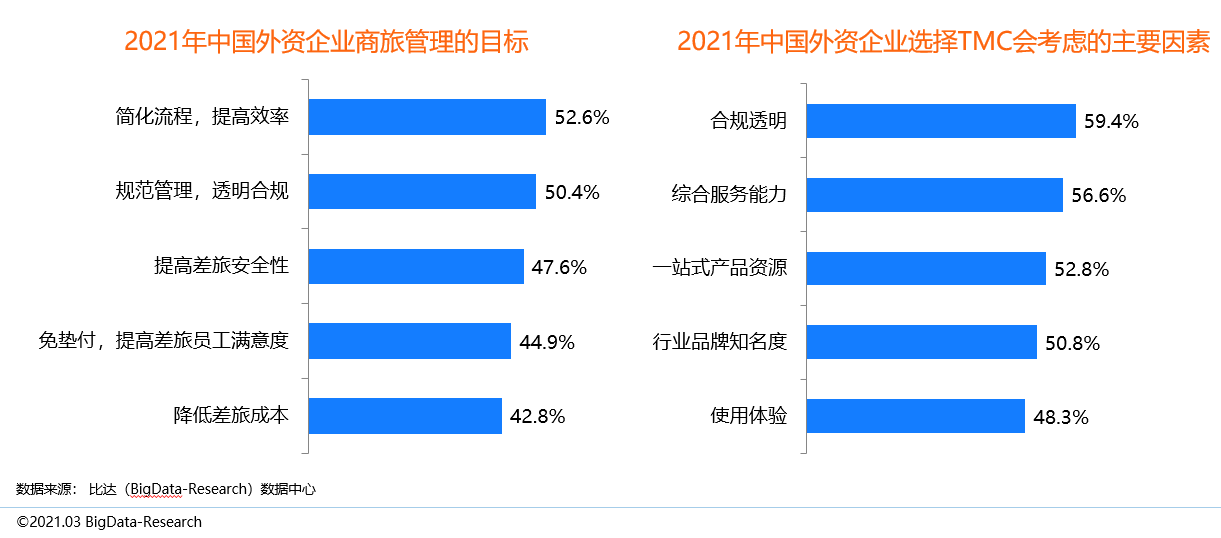 2021年,中國外資企業(yè)商旅管理的主要目標(biāo)包括:“簡化流程,提高效率”以及“規(guī)范管理,透明合規(guī)”;而選擇TMC會優(yōu)先考慮“合規(guī)透明”。