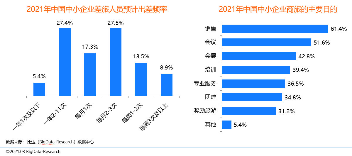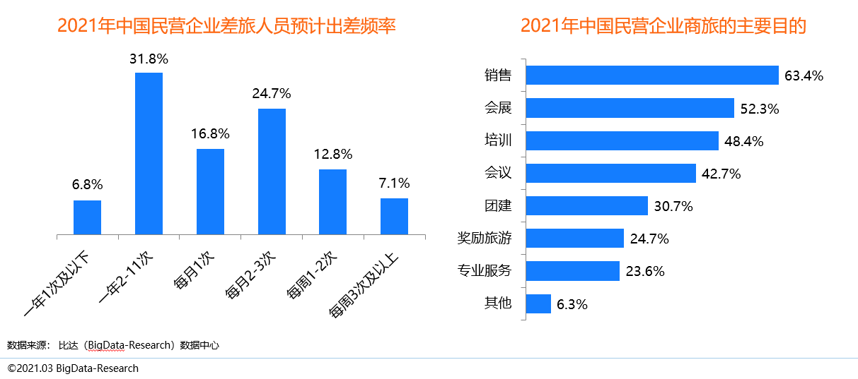 2021年出差旅人員預(yù)計一年2-11次的占比最高,達(dá)31.8%。而民營企業(yè)商旅的主要目的第一是銷售,其次為會展、培訓(xùn)和會議。