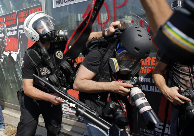 2013年6月11日,土耳其伊斯坦布爾,一名攝影記者在塔克西姆廣場(chǎng)拍攝群眾抗議游行時(shí)遭土耳其防爆警察推搡。