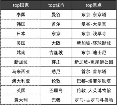 在景點(diǎn)方面,東京東京塔、曼谷大皇宮、東京淺草寺、新加坡環(huán)球影城、東京迪士尼、新加坡魚(yú)尾獅公園、首爾首爾塔、巴黎埃菲爾鐵塔、倫敦大英博物館、羅馬古羅馬斗獸場(chǎng)最受歡迎。相近的文化習(xí)俗、較低的語(yǔ)言門(mén)檻與完善的旅游服務(wù),吸引了大批中國(guó)游客選擇前往東南亞享受“黃金周”,但與此同時(shí),過(guò)去游客相對(duì)較少的小眾目的地,也以越來(lái)越強(qiáng)的姿態(tài)出現(xiàn)在長(zhǎng)線出境游名單中。