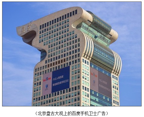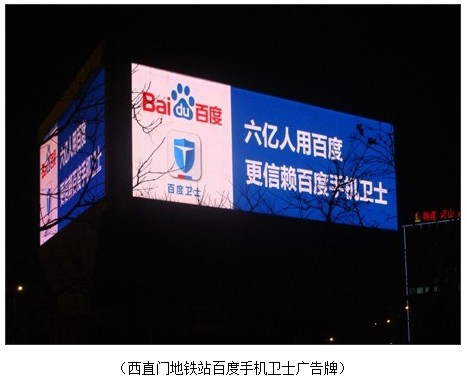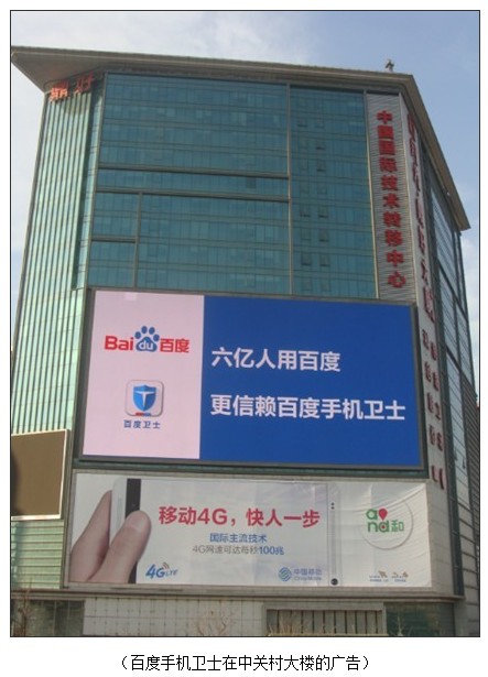盤古大觀、西直門北京北站廣場、中關(guān)村鼎好大廈——這些北京地標(biāo)性建筑物的廣告大屏幕幾乎一夜之間全被百度手機(jī)衛(wèi)士“攻占”,大屏幕上不斷閃爍的是一句簡練的廣告詞:“六億人用百度,更信賴百度手機(jī)衛(wèi)士”。