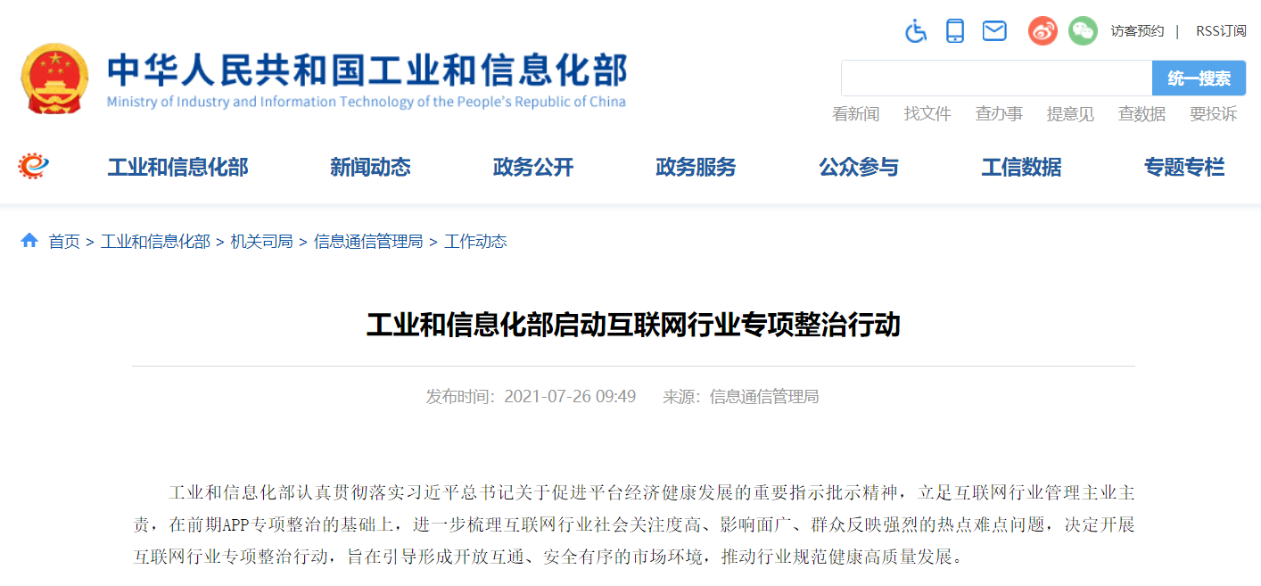 2021年7月23日,工業(yè)和信息化部召開互聯(lián)網(wǎng)行業(yè)專項(xiàng)整治行動(dòng)動(dòng)員部署電視電話會(huì)議,正式啟動(dòng)為期半年的專項(xiàng)整治行動(dòng)。工業(yè)和信息化部黨組成員、副部長劉烈宏出席會(huì)議并作動(dòng)員講話,總工程師韓夏出席會(huì)議。下一步,專項(xiàng)整治行動(dòng)將通過組織企業(yè)自查整改、收集核查線索、建立問題臺(tái)賬、強(qiáng)化執(zhí)法問責(zé)處置等方式,壓實(shí)企業(yè)主體責(zé)任,加強(qiáng)協(xié)同聯(lián)動(dòng),強(qiáng)化廉潔自律,做好宣傳引導(dǎo),形成長效機(jī)制,確保取得成效,切實(shí)提高人民群眾獲得感。