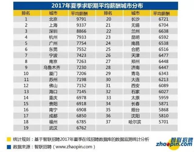 報(bào)告顯示,2017年夏季求職期,全國(guó)37個(gè)主要城市的平均招聘月薪為7376元,本季度平均薪酬下降幅度較大,為3.8%。其中,北京的平均薪酬水平依然保持第一名,為9791元。
