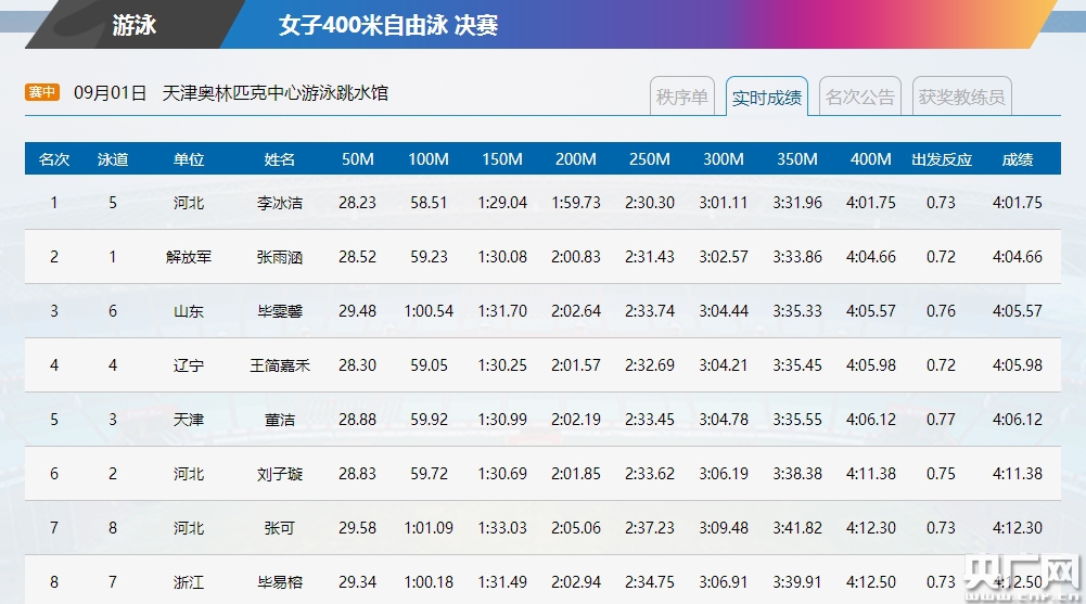 1日,第十三屆全運(yùn)會(huì)游泳項(xiàng)目進(jìn)入第二個(gè)比賽日,在女子400米自由泳決賽中,來(lái)自河北的15歲小將李冰潔以4:01.75獲得冠軍。解放軍張雨涵以4:04.66獲得亞軍,山東選手畢雯馨以4:05.57獲得季軍。