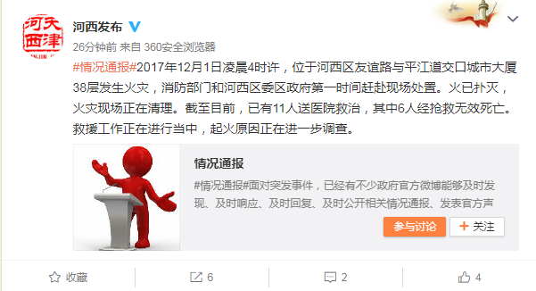 央廣網(wǎng)天津12月1日消息 據(jù)官方微博河西發(fā)布通報,2017年12月1日凌晨4時許,位于河西區(qū)友誼路與平江道交口城市大廈38層發(fā)生火災(zāi),消防部門和河西區(qū)委區(qū)政府第一時間趕赴現(xiàn)場處置;鹨褤錅纾馂(zāi)現(xiàn)場正在清理。截至目前,已有11人送醫(yī)院救治,其中6人經(jīng)搶救無效死亡。救援工作正在進行當(dāng)中,起火原因正在進一步調(diào)查。