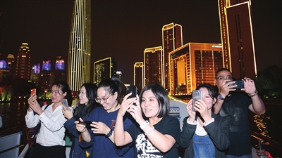 隨著游船緩緩駛出碼頭,大家趕緊拿出手機(jī)、相機(jī),選好角度,架起“長槍短炮”,時刻準(zhǔn)備著定格最美瞬間,生怕錯過任何一處景致。的確,記者在船中也有著同樣的感受:遠(yuǎn)遠(yuǎn)望去,海河夜景呈現(xiàn)出橘與黃搭配的暖色調(diào),在這種充滿藝術(shù)感的氛圍中,海河水面閃爍的波光燈影的美、流動不息的美,揮之不去,一種歡喜而眷戀的心情油然而生。