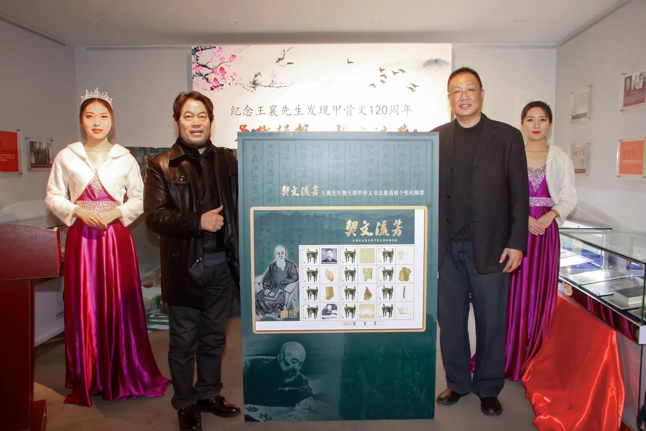 活動現(xiàn)場由天津近代歷史文化博物館出資,由中國郵政天津公司出品的“契文流芳紀(jì)念王襄先生發(fā)現(xiàn)甲骨文120周年”為主題的郵折和首日封進(jìn)行了現(xiàn)場揭牌與簽字首發(fā)。現(xiàn)場還有近50余件甲骨文實物和百余幅甲骨文書法作品進(jìn)行展覽。
