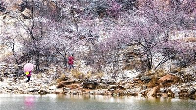 昨天,天津市薊州區(qū)盤山等多座山峰迎來了小雪天氣,恰逢山桃燦爛,白色的落雪飄落在或粉或紅的桃花上,形成了津城春季罕見而又美麗的桃花雪景觀,讓登山游覽的游客驚嘆不已。(錢進(jìn) 攝)