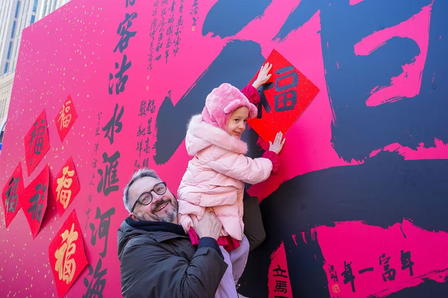 許多游客受現(xiàn)場氛圍感染,也紛紛挽起袖子,提筆蘸墨,在書法家指導(dǎo)下寫下新年的頭一份期許。活動甚至吸引到了外國游客的加入,其中法國友人米歇爾·沙東還帶著自己的女兒AEL一同參與,父女倆認(rèn)真執(zhí)筆,一筆一劃臨摹福字,沉浸式感受中國福文化的獨(dú)特魅力。隨著現(xiàn)場創(chuàng)作的數(shù)十幅福字被錯(cuò)落有致地張貼,一面寓意福氣滿堂的“百福墻”在津?yàn)硰V場入口處亮相,成為了新春的特色打卡景觀。