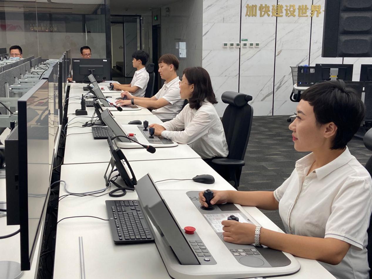 天津港智慧港口的建設(shè)也改變了港口人的工作方式。遠(yuǎn)程自動化操控司機(jī)丁亞楠(右一)在中央控制室遠(yuǎn)程控制集裝箱的裝卸,每天可以完成最多660個集裝箱的抓取。右五為丁亞楠丈夫張洪宇。(央廣網(wǎng)記者 李欣 攝)