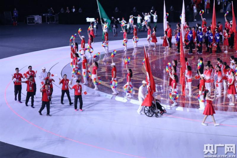 開(kāi)幕式于當(dāng)晚20時(shí)正式開(kāi)始。在護(hù)旗手的護(hù)衛(wèi)下,中華人民共和國(guó)國(guó)旗、殘運(yùn)會(huì)會(huì)旗、特奧會(huì)會(huì)旗分別入場(chǎng)。隨后裁判員代表方隊(duì)和35個(gè)代表團(tuán)的殘疾人運(yùn)動(dòng)員代表依次入場(chǎng)。