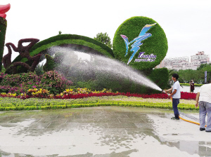 迎接全運盛會的到來,本市布置的立體園林景觀,前期的設(shè)計、栽植等工作,園林工人們付出了辛苦的努力。在它們?nèi)A麗亮相之后,繁重的養(yǎng)護工作就開始了。據(jù)譚國棟主任介紹:從平時的養(yǎng)護細節(jié)上,安排了專業(yè)水車,每天進行澆水和專業(yè)“養(yǎng)顏”,這里面包括兩大部分,一部分是立體草雕,它們的高度從3米到8米不等,對于這些身材高大的“巨人”,在布置時,就已經(jīng)在它們體內(nèi)設(shè)置了“淋浴”系統(tǒng),通過水車把水輸送到草雕上部就可以實現(xiàn)噴灌、滴灌、滲灌。所以,人們看到的草雕“津娃”,各種運動項目造型等等,都那么干凈、茂盛,這都是科學“洗澡”的功效。另一部分是平面的花卉澆水,主要通過水車,用噴淋,噴灑的形式進行水分供給,養(yǎng)護的時候還要看天氣的情況和花卉本身的干濕度進行水分養(yǎng)護,確;ɑ苷IL。