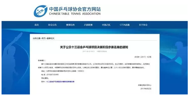 8月2日,國家體育總局乒羽中心在中國乒乓球協會網站上公示了8月將在天津舉行的第十三屆全運會乒乓球項目參賽名單。