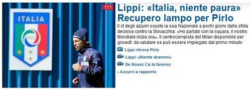 《羅馬體育報》預測里皮將在最后一場和斯洛伐克的比賽中作出一些改變,老帥會在加圖索和馬爾基西奧中選擇一人出任中場,基耶利尼可能被移到左路,而卡納瓦羅和博努奇將搭檔中衛(wèi)。鋒線上,吉拉迪諾一直找不到感覺,但里皮無人可用,帕齊尼很難得到機會,也許夸利亞雷拉能夠制造點驚喜,里皮還有兩天時間來做出最后決定。