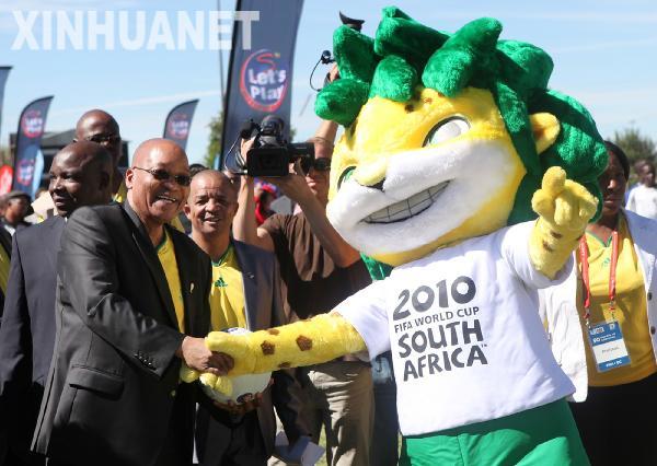 4月21日,南非總統(tǒng)祖馬(前左)與南非世界杯吉祥物豹娃“扎庫米”握手。當日,在世界杯倒計時50天之際,南非北開普省金伯利市舉行了盛大的慶;顒,南非總統(tǒng)祖馬和南非世界杯組委會官員等參加了慶祝活動。新華社發(fā)(梁銓攝)