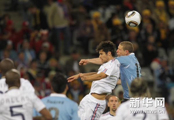 6月11日,法國隊球員古爾庫夫(上左)與烏拉圭隊球員迭·佩雷斯(上右)爭頂。當日,在2010南非世界杯A組第二場比賽中,烏拉圭隊與法國隊以0比0戰(zhàn)平。新華社記者邢廣利攝