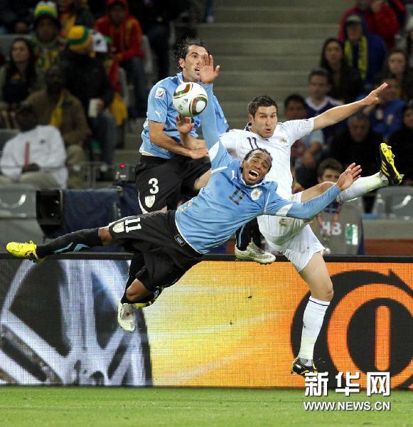 6月11日,法國隊球員吉尼亞克(右)與烏拉圭隊球員阿·佩雷拉(下)、迭·戈丁拼搶。當日,在2010南非世界杯A組第二場比賽中,烏拉圭隊與法國隊以0比0戰(zhàn)平。新華社記者邢廣利攝