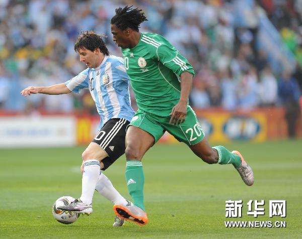 6月12日,尼日利亞隊球員奧巴費米·馬丁西(前)在比賽中拼搶。當(dāng)日,在2010南非世界杯小組賽B組比賽中,尼日利亞隊以0比1不敵阿根廷隊。新華社記者徐速繪攝
