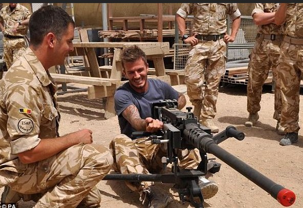 沒有了世界杯的日子小貝并不寂寞,當?shù)貢r間5月22日,萬人迷貝克漢姆來到阿富汗的一座英國部隊的軍營進行參觀,現(xiàn)場體驗各種重型武器,并與士兵們親密合影。這一舉動被英國媒體描述為“瘋狂的”。圖為貝克漢姆在軍營體驗的精彩瞬間。
