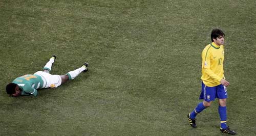 北京時間6月21日,巴西3-1戰(zhàn)勝科特迪瓦,比賽進(jìn)行到第88分鐘,卡卡再次在無球狀態(tài)下碰倒了科特迪瓦球員,你很難說這是一個肘擊動作,現(xiàn)場能看見的就是科特迪瓦球員捂著臉痛苦的倒地?铺氐贤咔騿T立刻沖向了卡卡,卡卡則在第一時間朝后場跑去,盧西奧護(hù)在卡卡面前,更多的巴西球員跑了過來,阻擋科特迪瓦球員的沖擊,現(xiàn)場一片混亂。裁判走向卡卡,掏出第二張黃牌,卡卡紅牌出場。盧西奧憤怒的向裁判表示抗議,羅比尼奧也十分不理解的揮舞著雙手,但一切都已經(jīng)晚了,卡卡搖著頭,微笑著退場。