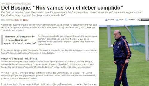 北京時(shí)間6月4日凌晨,西班牙在奧地利因斯布呂克與韓國(guó)進(jìn)行了一場(chǎng)世界杯熱身賽,雙方鏖戰(zhàn)90分鐘后,西班牙憑借85分鐘的一粒入球以1:0小勝韓國(guó)隊(duì)。賽后,西班牙主帥博斯克接受了西班牙媒體《馬卡報(bào)》的采訪。