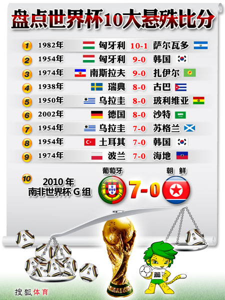 中廣網(wǎng)北京6月22日消息 北京時(shí)間6月21日,2010年南非世界杯G組將進(jìn)入第二輪爭(zhēng)奪。在開(kāi)普敦綠點(diǎn)球場(chǎng),葡萄牙隊(duì)與朝鮮隊(duì)交鋒。經(jīng)過(guò)90分鐘鏖戰(zhàn),葡萄牙7-0狂勝朝鮮隊(duì),取得本屆世界杯開(kāi)賽以來(lái)最大比分勝利。但這并不是世界杯上比分最懸殊的比賽,以上就是歷屆世界杯比賽分?jǐn)?shù)比較懸殊的盤(pán)點(diǎn)。