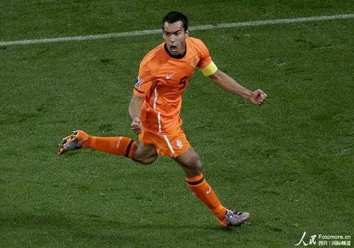 為荷蘭隊打開勝利之門的不是小飛俠羅本,也不是此前表現(xiàn)出色的斯內(nèi)德,而是老隊長范布隆克霍斯特。這位年已35歲、為橙衣軍團(tuán)出戰(zhàn)超過100場的老將在第18分鐘用一腳精彩的遠(yuǎn)射敲開了烏拉圭門神穆斯萊拉的十指關(guān),也敲開了荷蘭隊的決賽之門。