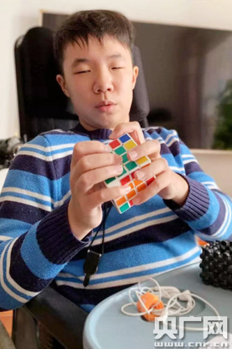 如今的他,喜歡玩魔方,六階七階和異形魔方都不在話下,他還愛音樂,吉他和葫蘆絲都是他喜歡的。
